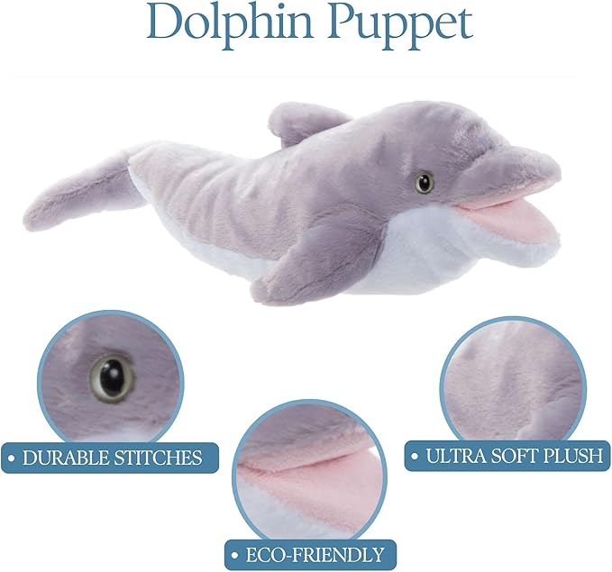 - This dolphin plush toy puppet features a soft white underbelly, curious eyes, distinct fins and a wide smile encouraging fun.