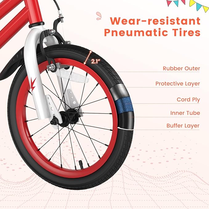 - [ Durable Wheels & Sturdy Frame ]: Anti-slip tires and detachable training wheels ensure steadiness and are helpful for beginners to practice balance. The training wheels can be removed when your child is ready. Meanwhile, the carbon steel frame helps to create a long-term use of the kids training bike.
