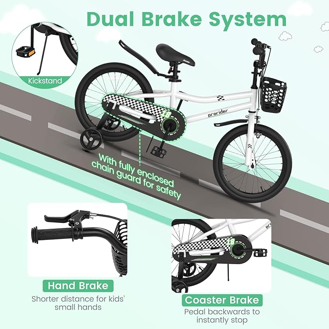- [ Safe Dual Brakes & Enclosed Chain ]: Besides a hand brake, this kids bicycle is designed with a coaster brake which is suitable for small kids who don’t have enough power to control brake by hand. In the meantime, the enclosed chain guard can protect kids from getting hurt and provide a safer pedaling environment.