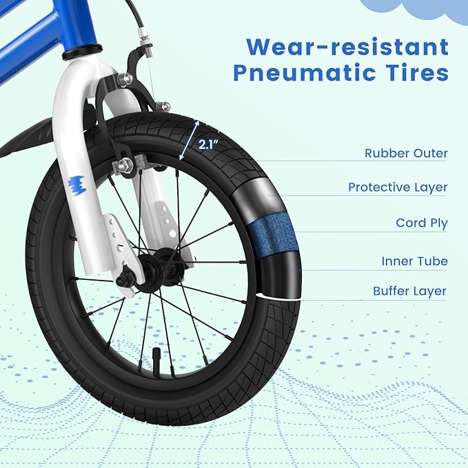 - [ Durable Wheels & Sturdy Frame ]: Anti-slip tires and detachable training wheels ensure steadiness and are helpful for beginners to practice balance. The training wheels can be removed when your child is ready. Meanwhile, the carbon steel frame helps to create a long-term use of the kids training bike.