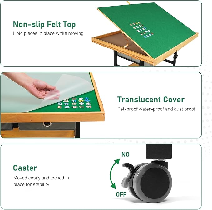 - 【Adjustable Angle and Height】The ALL4JIG multi-functional puzzle board is designed for optimal comfort and flexibility. The boardtop can be adjusted to three different angles within 30 degrees, allowing you to find the perfect position for your puzzle activities. Additionally, the board height is fully adjustable between 29 inches and 37.4 inches. By rotating the four screw buttons, you can easily set the desired height and angle to suit your comfort and needs. This feature ensures a comforboard and ergonomic experience for puzzle enthusiasts.