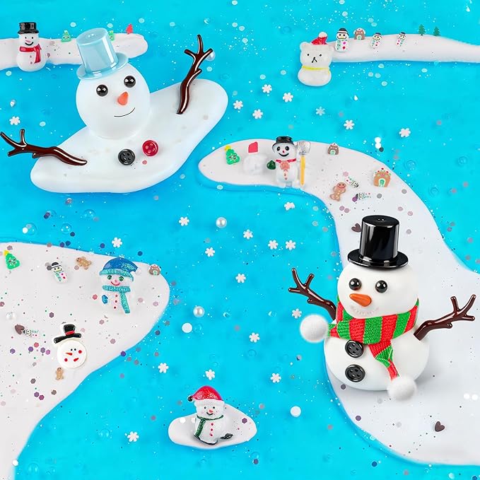 - ☃️【Snowman Clear Slime Kit】Our kids snowman kit not only includes a variety of accessories for making a snowman, but also includes 6 bottles of 50ml clear crystal slime, 6 packets of slime add ins and 6 adorable snowman charms. Crystal slime retains its translucent texture no matter how much it is stretched, but it needs to be stretched slowly as its texture is relatively brittle compared to other slimes. The mix of clay and slime also creates a different kind of fun with this snowman craft kit!