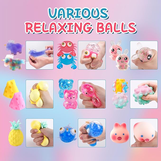 - 【Perfect Gift & Party Favors】The squeeze balls set comes an exquisite gift portable packing box, and these quish balls are perfect as birthday gifts, Valentines day gifts, and prizes. These fidget balls are a huge surprise and are perfect for party supplies, carnival theme party decorations, Easter basket stuffers, , Halloween balls in bulk and Christmas gifts. Take them home, keep happy all day!