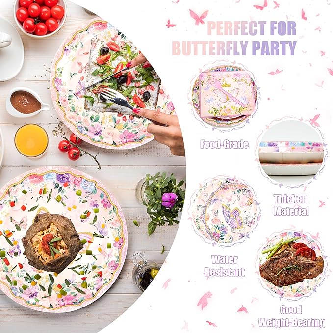 - 🩷[Premium Quality] All butterfly birthday party supplies are made of food-grade materials that are environmentally friendly, non-toxic and recyclable. Butterfly plates are made of thick paper and film laminated, safe and durable. Butterfly napkins are soft and absorbent. Providing you with a worry-free dining experience.