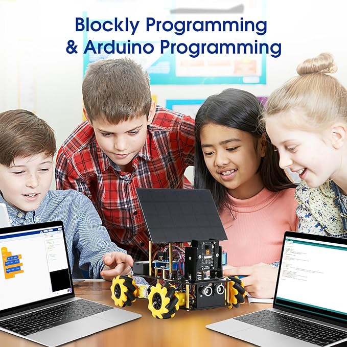 - ACEBOTT Smart Camera Solar Robot Car Kit: An educational kit for STEM beginners (kids) based on ESP32, built with omnidirectional Mecanum wheels, using high-quality metal gear servos, equipped with HD cameras, solar panels and ultrasonic infrared sensors, and programmed with Arduino, designed to help them learn how to build and program a fully functional robot, improve logical thinking and electromechanical skills, suitable for experimental projects or school training for teenagers and adults.