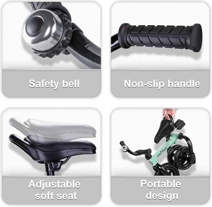 - Product Features: Newly designed trike provide comfortable riding experience for your boy or girl throughout whole childhood. Foldable design for convenient outdoor play and storage. Non-slip Handlebar, detachable Pedal and adjustable seat(seat height is adjustable from 15.7 to 18.5 inch).