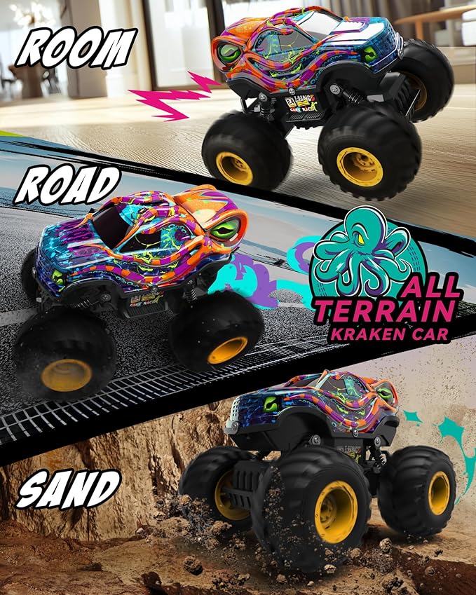 - 【Kraken-Inspired Monster Design】 This isn’t just a toy—it’s a sci-fi adventure on wheels! This wild monster truck features a bold octopus theme with vivid colors and fierce details—perfect for kids who love ocean creatures and sci-fi adventures. Nice presents for kids ages 4-8.