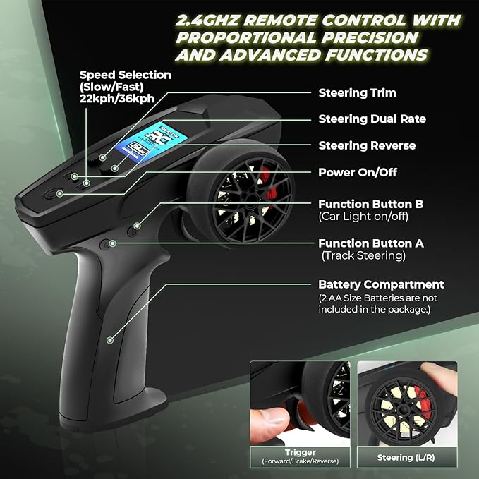 - Equipped with a high-performance brushed RC 380 motor and efficient drivetrain, this fast rc car can reach speeds up to 36 km/h, delivering an exciting ride.
