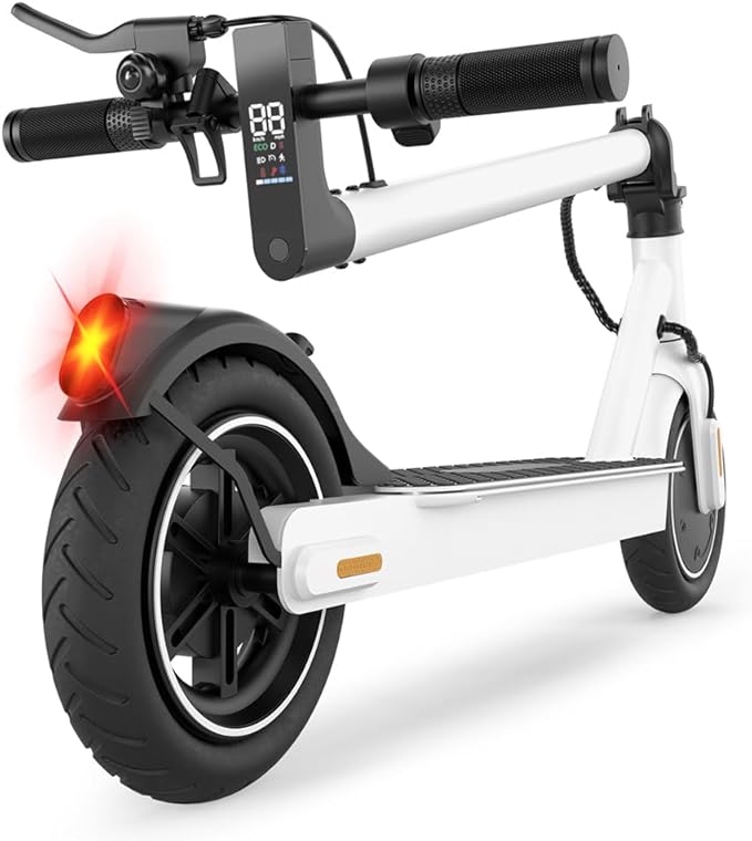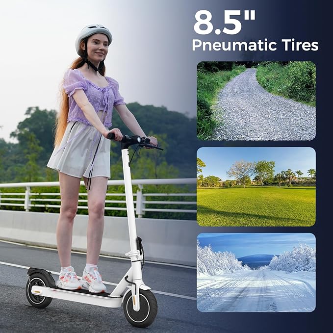 - 8.5" PNEUMATIC TIRES & IPX4 WATER RESISTANCE: This fast electric scooter has 8.5-inch air-filled tires that provide shock absorption and grip, which easily climb 20° slopes. With an IPX4 waterproof rating, it can withstand splashes and light rain, making it a reliable choice for commuters and adventure seekers alike.