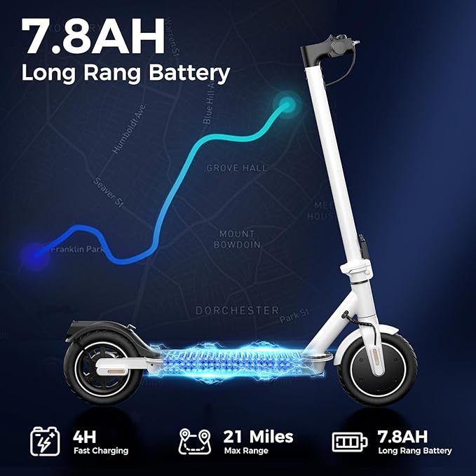 - LONG BATTERY LIFE: Foldable Scooter rides up to 21 miles on a single 5-hour charge, uses a 42V 7.8AH powerful battery built for short trips to school, work, or around the neighborhood without the worry of running out of battery