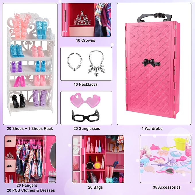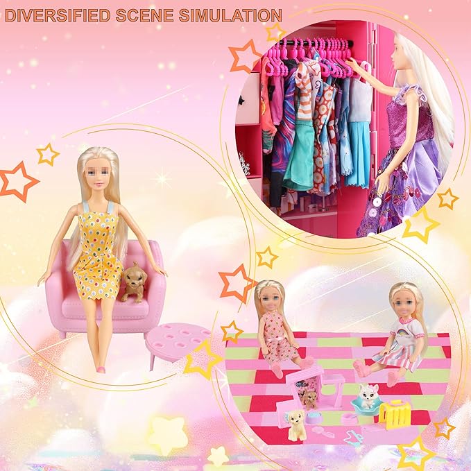 - Rich Combinations:Including 20 clothes, 20 bags, 20 shoes, 20 hangers, 20 glasses, 10 necklaces, 10 crowns, 35 accessories, 1 shoe rack, 1 wardrobe, 1 tent, 1 picnic mat, 1 set of sofas, 3 pets, 1 pet house, 1 pet cage, 18 accessories(Random color)(Includes 2 5.5-inch dolls, excluding 11.5-inch dolls)