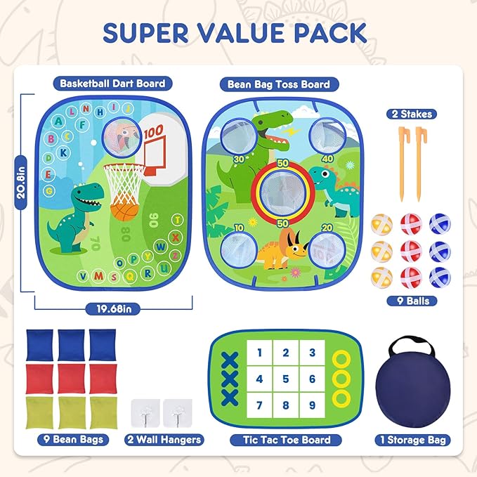Dinosaur Cornhole Games Set for Kids, 6-in-1 Bean Bag Toss Game,Basketball Dart Board, Sports Play and Learn Eduational Toys for Toddler, Indoor Outdoor Games Toys Gifts for Kids Age 3 4 5 6 7 8